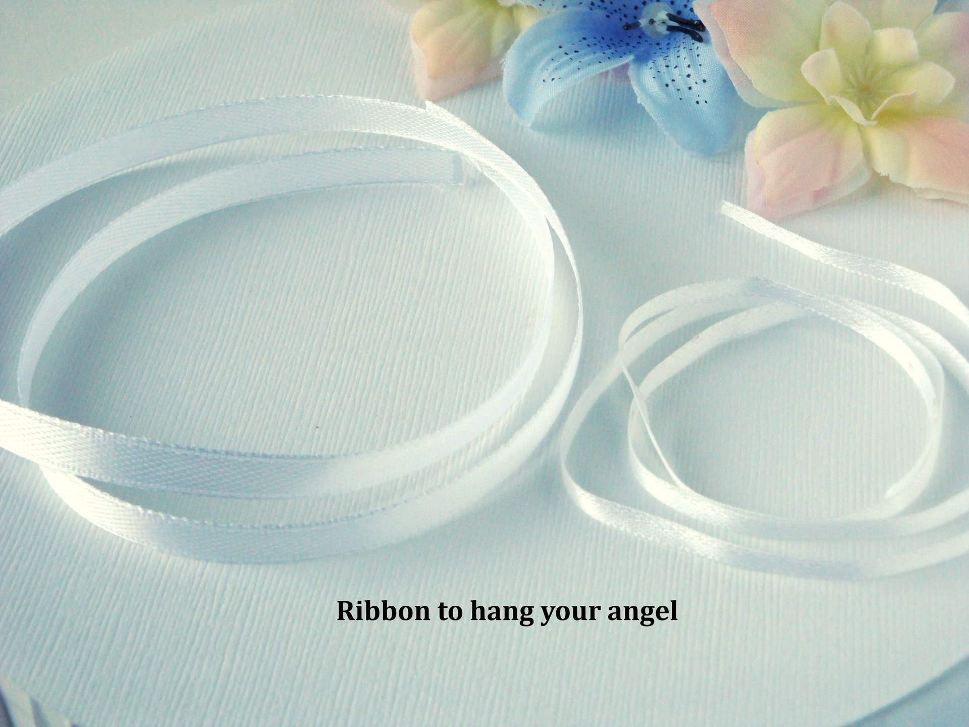 Measures 5" long and comes with 18 inches of White Ribbon to Hang.